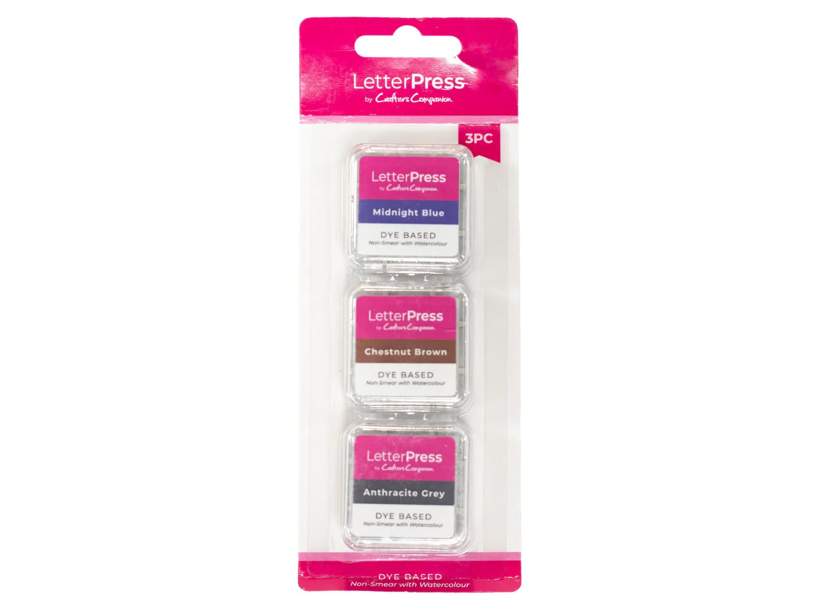 - LetterPress Inkpad in Midnight Blue, Chestnut Brown, and Anthracite Grey.