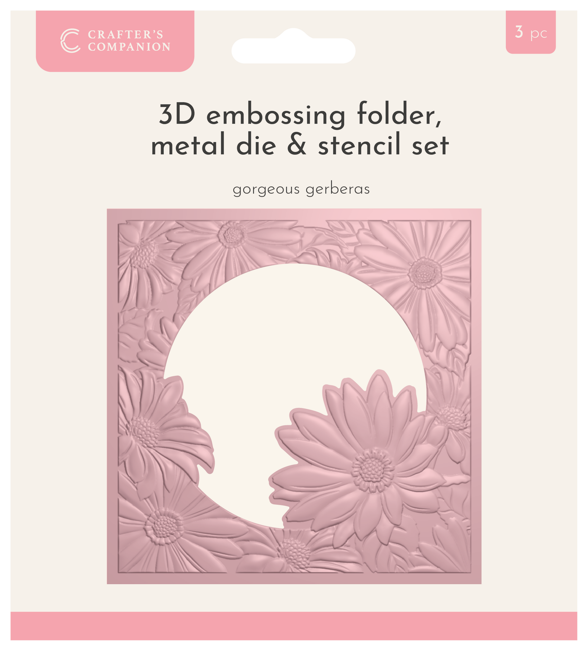Crafters Companion 5.5” X 5.5” 3D Embossing Folder, Metal Die and Stencil Set - Gorgeous Gerberas