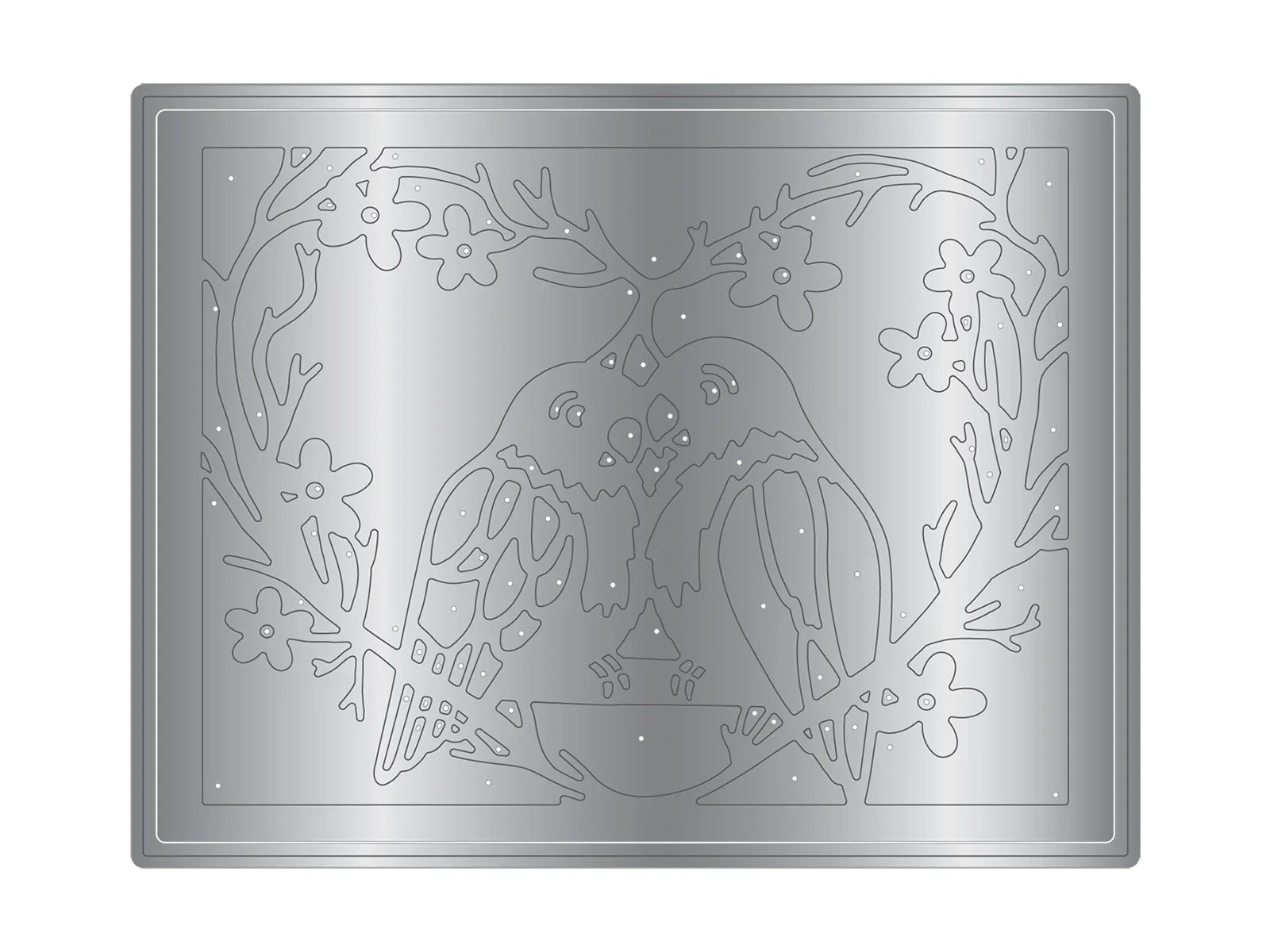 - Two metal dies that cut out two lovebirds on a heart-shaped branch.