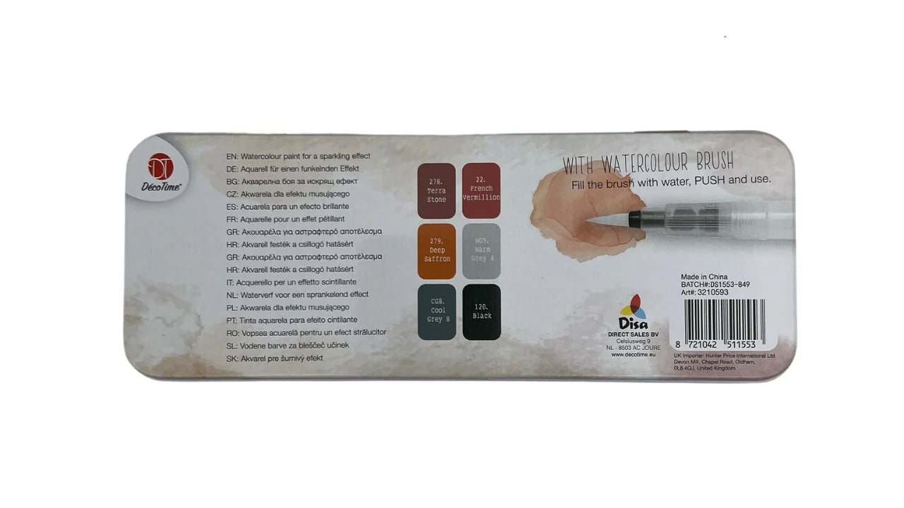 Deco Time Water Colour Paint - Urban Alloy DecoTime Watercolour Paint Sets - 6 Colours in these Deco Time 6pk watercolour paints which are the perfect addition for any professional and hobbyists alike. Available in an assortment of colours, perfect for use with canvases and more. Watercolour paint for a sparkling effect. Instructions: Fill the brush with water, push and use a test sheet before you start drawing. Clean the brush with water.