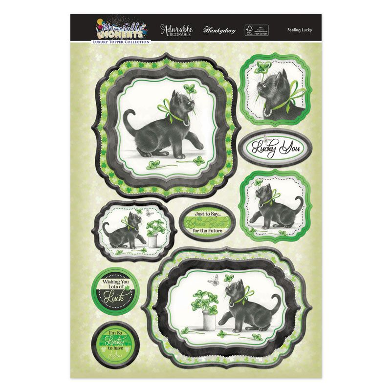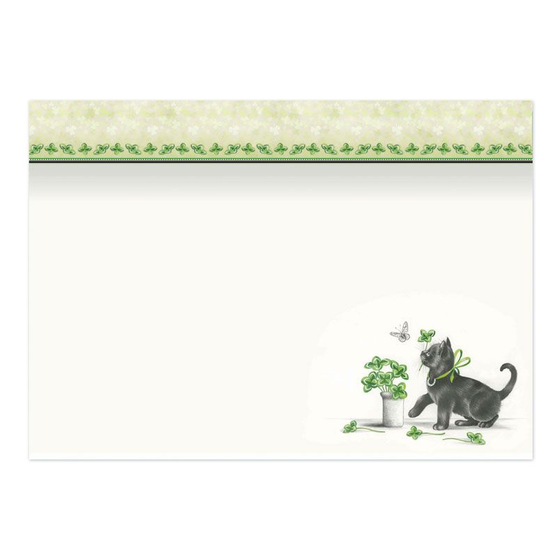 - Features a black kitten and four leaf clovers