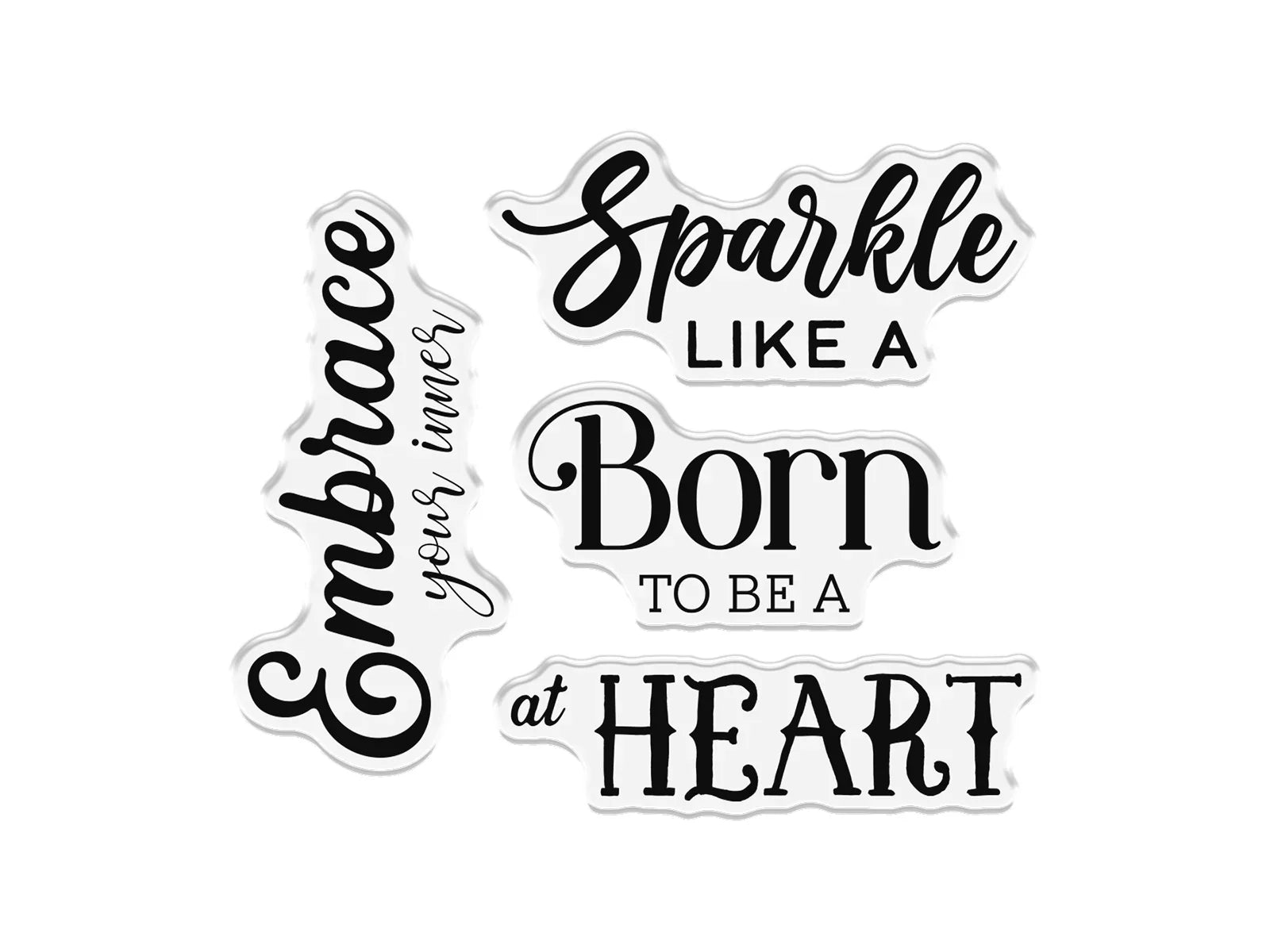 - 5-piece set that includes four acrylic stamps and one metal die.
