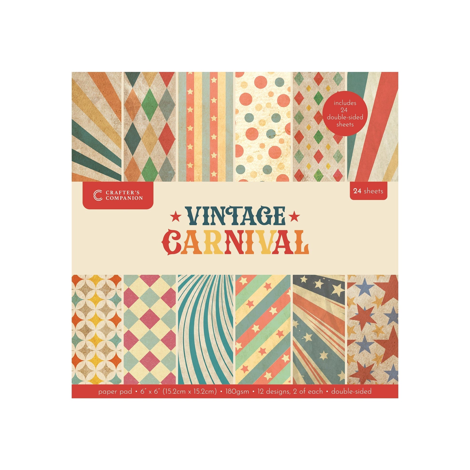 Vintage Carnival 6” x 6” Paper Pad Roll up, roll up, and gaze in awe at the Vintage Carnival collection by Crafter's Companion! Bring the nostalgia of classic carnivals and fairgrounds to your crafts and projects with the looks of this latest range of crafting materials, including stamps, dies, and stencils of everything from Ferris Wheels and Helter Skelters to tickets and lettering. With this collection, the circus can always be in town! Create colourful invitations, fun cards, and more with the Vintage Carnival 6″ x 6″ Paper Pad by Crafter's Companion. Each pad features 24 sheets of 12 worn, classic carnival designs. These double-sided sheets are perfect for a range of papercraft projects, including cardmaking, scrapbooking, and bespoke gift boxes and bags. 24 sheets of double-sided paper with worn, classic carnival designs 12 designs, two sheets of each Part of the Vintage Carnival collection by Crafter's Companion